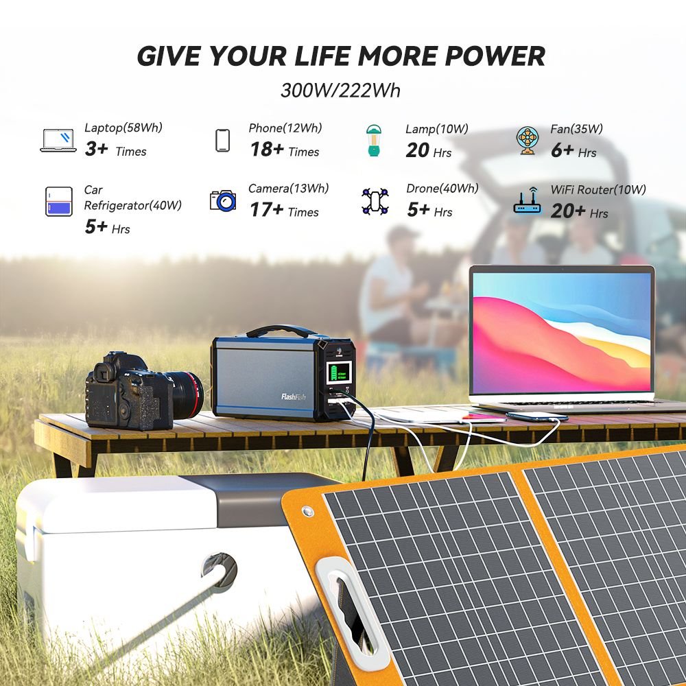 Flashfish G300 portable power station is our upgraded version for outdoor activities’ power supply.With big capacity 222Wh/60000mAh, which can fulfill your demand in weekend trip, camping, hiking, backpacking, hunting, fishing or trekking.3 different output ports (2*Quick Charge 3.0+1*USB, 2*AC, 2*DC) can charge most of your devices, including laptop, phone, tablet, fan, drone, car fridge, radio, LED light, MP3, digital cameras etc. Convenient 3 ways of recharging (solar panel, wall charger, car charger) can get juice back easily.