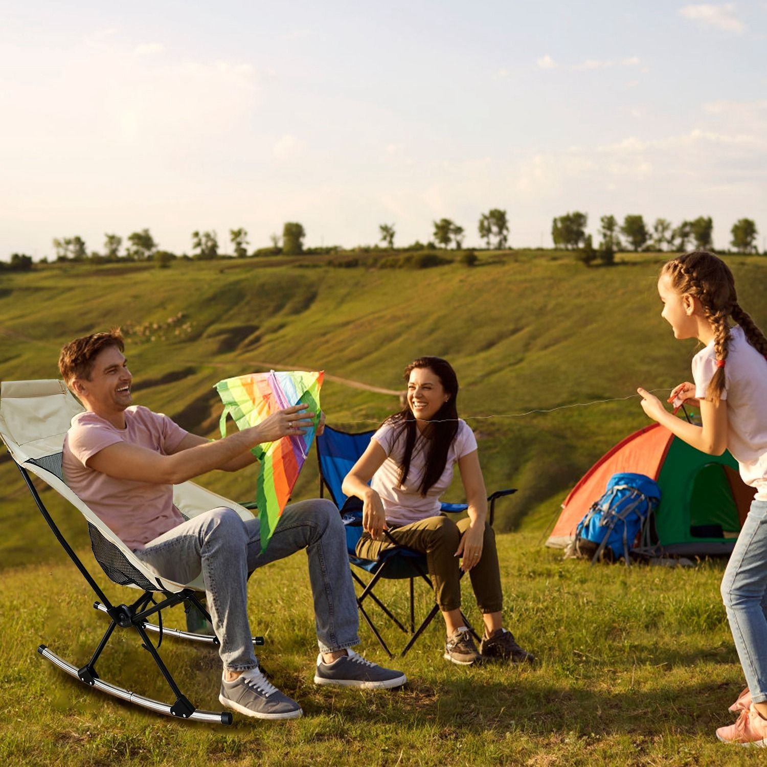 *Easy to Setup*:You can install this foldable camping chair in 5minutes without tools needed. First,set up the supporting frame and hang on the storage bag,then insert the tube into the slot of chair cloth. Finally,insert the frame into the curved rocking legs and connect the rocking legs. Make sure every part of this rocking chair is tightly fixed.