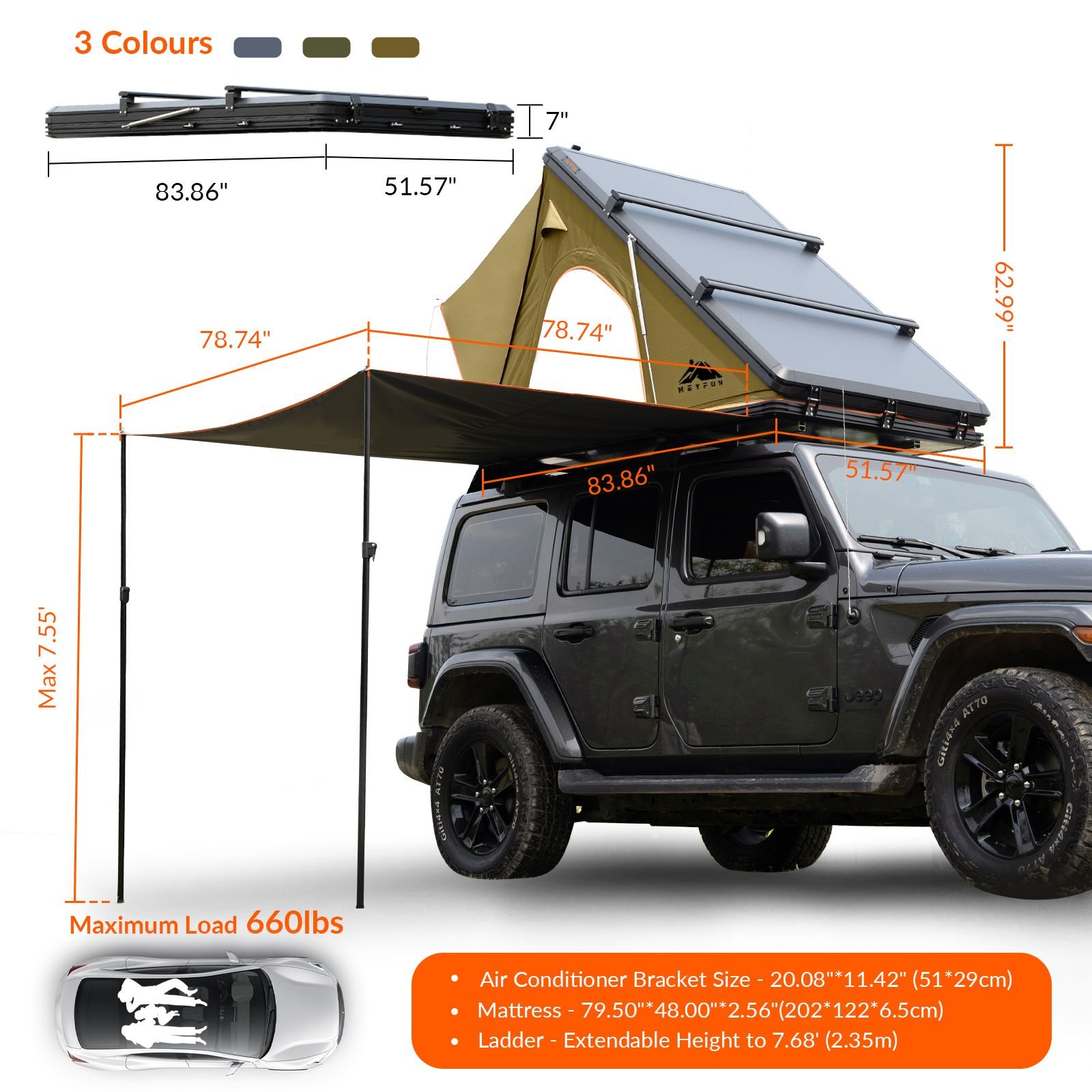 Explorer Plus Rooftop Tent Hardshell with Side Awning, Air Conditioner Outlet with Bracket, Luggage Racks&Replaceable Netting Rain Curtain